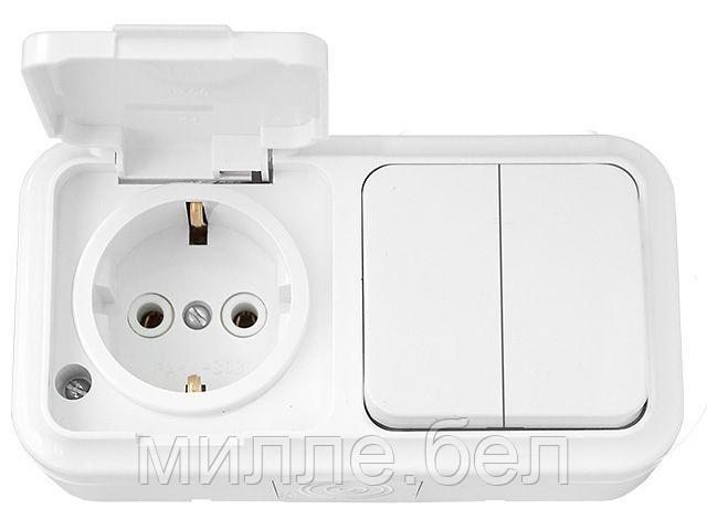 Блок выкл. 2 клав. + розетка (открытая, с/з, брызг. защ.) белая, Пралеска Аква, Bylectrica (IP54Блок выкл. 2 клав. + розетка (открытая, с/з, брызг. защ.) белая, Пралеска Аква, Bylectrica (IP54